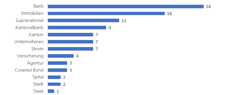 Die meisten Schuldner, die in der Schweiz nachhaltige Anleihen emittieren, kommen aus der Finanzbranche – aus dem Bankensektor, inklusive Kantonalbanken und Versicherungen. Daneben wird der Immobiliensektor immer mehr zu einem gewichtigen Emittenten von grünen Anleihen. Energiesparende Sanierungsprojekte bestehender Gebäude (Ersatz von Ölheizungen, verbesserte Wärmedämmung) oder Solarprojekte eignen sich hervorragend als grüne Assets.