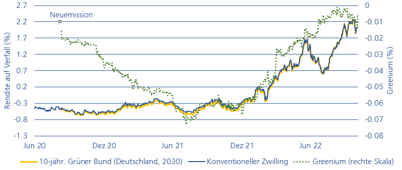 Für den Verfall im Jahr 2030 hat Deutschland eine klassische und grüne Anleihe emittiert. Die identische Laufzeit erleichtert den Vergleich der Renditedifferenz. Die gepunktete grüne Linie zeigt dabei die Greenium. Bei der Emission im Sommer 2020 wurde mit einem Greenium von einem Basispunkt (Bps) emittiert. Diese stieg bis zum Sommer 2021 bis auf 7 Bps. und bewegte sich seither wieder in Richtung einen Basispunkt zurück. Aktuell ist der Ertrag der grünen Anleihe im Vergleich zu klassischen Anleihen einen Basispunkt pro Jahr tiefer.