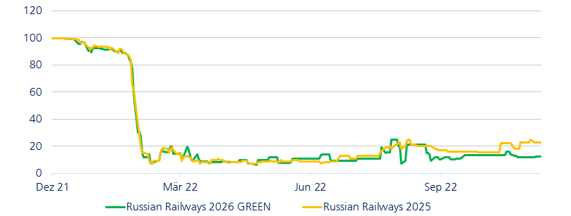 Die russischen Staatsbahnen sind seit jeher ein regelmässiger Emittent im Schweizer-Franken-Markt. Die Emissionen sind als Loan Participation Notes strukturiert und werden via Irland begeben. Anfang 2022 hatte die russische Eisenbahn im CHF-Markt fünf Anleihen ausstehend, davon zwei grüne, eine davon sogar als nachrangige Anleihe mit ewiger Laufzeit (Perpetual). Nach dem Einmarsch von Russland in die Ukraine und den westlichen Sanktionen verloren diese Anleihen dramatisch an Wert. Die vorrangige grüne Anleihe ist mit den anderen Anleihen in der Kapitalstruktur gleichgestellt und würde bei einem Ausfall die gleiche Zahlung aus der Abwicklung erhalten wie die konventionellen Bonds. Wir waren und sind in dieser vorrangigen Anleihe nicht investiert.