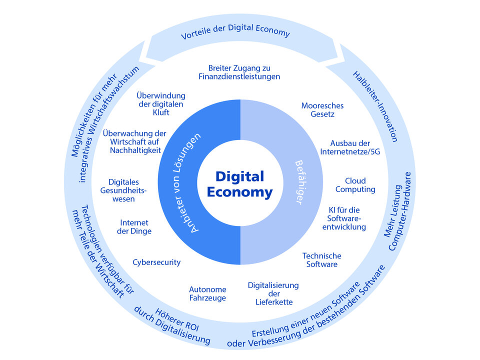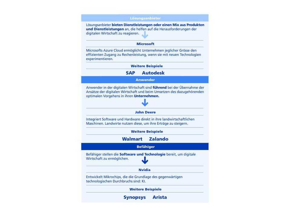 Die digitale Wirtschaft ist eng mit der Digitalisierung verbunden, einem langfristigen Investitions­thema. Unserer Analyse zufolge bestehen dort weiterhin beträchtliche Möglichkeiten, den Einsatz von Technologie in der Wirtschaft und in der Gesellschaft insgesamt zu erhöhen. Anlegerinnen und Anlegern bietet das Thema «digitale Wirtschaft» eine breite Palette an Investitions­möglichkeiten: Wir fokussieren dabei auf die Bereiche digitale Infrastruktur und Zugang, Sicherheit, Umwelt­schutz sowie Befähigung von Menschen. Im Zentrum dieses Ansatzes stehen die Lösungs­anbieter der ersten Stunde, zudem Unternehmen, die solche Lösungen in ihren Prozessen anwenden, sowie die so genannten Befähiger (Adopters). Letztere stellen Software und Technologien bereit, um die digitale Wirtschaft zu unterstützen (siehe Grafik unten).