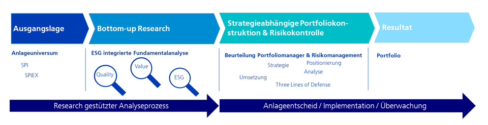 Nach erfolgter umfassender ESG integrierter Fundamentalanalyse der einzelnen Unternehmen setzen die Portfoliomanagerinnen und -manager unter Berücksichtigung des aktuellen Anlageumfelds, des Preispotenzials sowie der Marktliquidität ihre Portfolios gemäss Strategievorgaben um. Die Portfolios werden stets durch drei unterschiedliche Risikoinstanzen (Three Lines of Defense) beurteilt und überwacht.