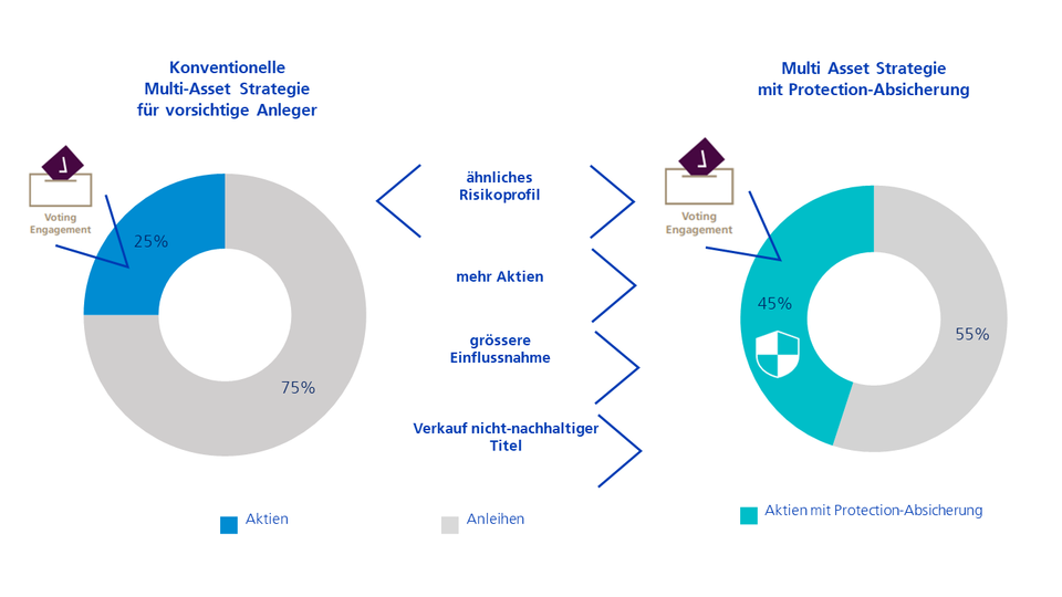 Die Absicherung mit der Protection-Strategie ermöglicht es, den Aktienanteil im Portfolio zu erhöhen und den Obligationenanteil entsprechend zu reduzieren - ohne zusätzliches Risiko. Inhaberinnen und Inhaber von Aktien geniessen ein Mitspracherecht bei der Ausrichtung der Geschäftsaktivitäten. Nachhaltige Anliegen können auf diese Weise mehr Gewicht bekommen.