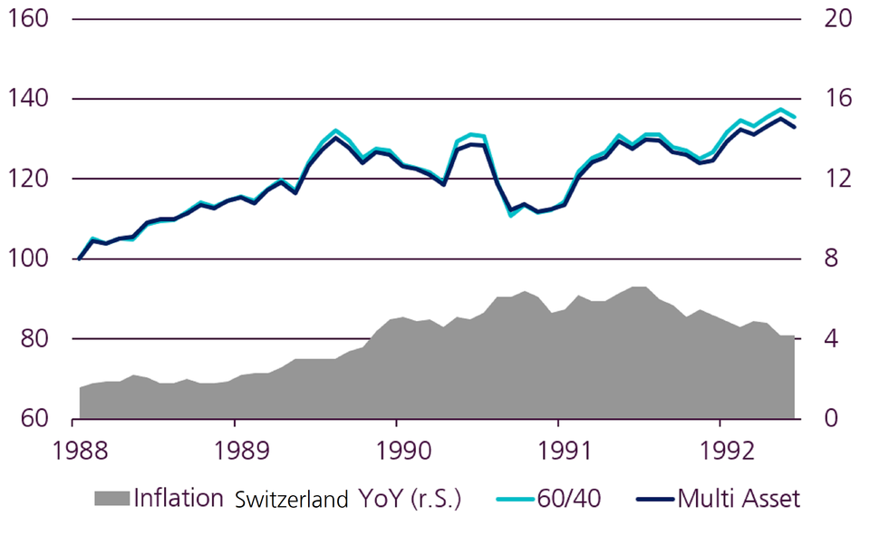 After Black Monday in 1987, when the Dow Jones collapsed by almost 23% within one day, interest rate hikes also combated the sharp rise in inflation (from 1% to 6% in the USA and Switzerland). In contrast to the 70s, however, inflation did not get out of hand; interest rates were higher at the beginning of monetary tightening than they are today. Tightening therefore remained moderate and growth robust. In the subsequent recession, in the early 90s, central banks cut interest rates early on. The resulting positive yield on bonds limited the drawdown of the 60/40 portfolio to -15.2%. Here too, the losses in the multi-asset portfolio were somewhat smaller thanks to the real assets. |