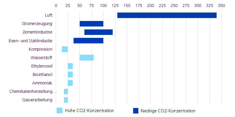 Die rasche Realisierung dieses Potenzials ist massgeblich von den Gesamtkosten abhängig. Derzeit liegen die Kosten für die CO2-Abscheidung zwischen rund 330 USD/t für die direkte Abscheidung aus der Luft und zirka 20 USD/t für die Erdgasverarbeitung. Die hohe Variabilität der Kosten ist primär auf die unterschiedlichen CO2-Konzentrationen zurückzuführen. Hohe Konzentrationen verursachen in der Regel niedrigere Kosten pro Tonne.